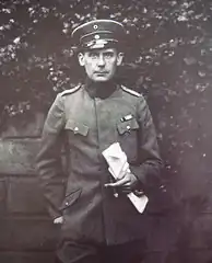 Gropius's career was interrupted by the outbreak of World War I in 1914. He was drafted in August 1914 and served as a sergeant major at the Western front during the war years (getting wounded and almost killed)[12] and then as a lieutenant in the signal corps.[13] Gropius was awarded the Iron Cross twice[14] ("when it still meant something," he confided to his friend Chester Nagel) after fighting for four years.[15] Gropius then, like his father and his great-uncle Martin Gropius before him, became an architect.