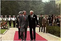 Walter Scheel (German:[ˈvaltɐˈʃeːl]ⓘ; 8 July 1919 – 24 August 2016)[1] was a German statesman. A member of the Nazi Party who joined the Free Democratic Party of Germany (FDP) in 1946, he first served in government as the Federal Minister of Economic Cooperation and Development from 1961 to 1966 and later as President of Germany from 1974 to 1979. He led the FDP from 1968 to 1974.[2]