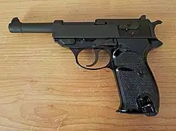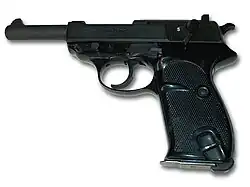 The Walther P38 (originally written Walther P.38) is a 9 mm semi-automatic pistol that was developed by Carl Walther GmbH as the service pistol of the Wehrmacht at the beginning of World War II. It was intended to replace the comparatively complex and expensive to produce Luger P08. Moving the production lines to the more easily mass producible P38 once World War II started took longer than expected, leading to the P08 remaining in production until September 1942 and copies remained in service until the end of the war.[7]
