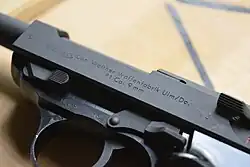 During WWII, the P.38 was produced by Walther, Mauser, and Spreewerk. To conceal manufacturer identities, each wartime manufacturer used a letter code: ac (Walther); byf (Mauser), and cyq (Spreewerk), followed by the date (e.g.: ac44: Walther 1944 production). Spreewerk did not mark production dates. Pistols were produced in blocks of 10,000 consecutively numbered pistols, with each block having a consecutive letter suffix, to conceal production volume. 1,277,680 P.38s were produced during WWII: 617,585 by Walther in Zella-Mehlis; 372,875 by Mauser in Oberndorf; 287,220 by Spreewerk Grottau.[14] Late in the war, the Spreewerk (cyq) die broke. Subsequent pistols appear to be marked "cvq" due to the broken die. About 31,400 pistols are so marked. Spreewerk production ended April 1945.[15]