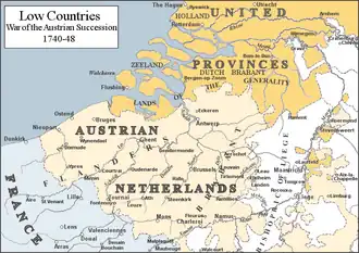 The Dutch Republic itself was now in danger. In April 1747, the French began reducing the Barrier Fortresses along the border with the Austrian Netherlands and invaded Dutch Flanders, which they swiftly captured. This prompted an Orangist revolution, which resulted in the appointment of William IV, Prince of Orange as stadtholder and head of the Dutch military.[104] The strategic situation, however, failed to change and at Lauffeld on 2 July 1747, Saxe won another victory over a British and Dutch army under the Prince of Waldeck and Cumberland; the French then besieged Maastricht and Bergen op Zoom, which fell in September.[103] Although the Dutch States Navy was in the poorest condition it had ever been in, its positioning in the estuaries and rivers of Zeeland and Holland, however, prevented French incursions into those provinces.[105]