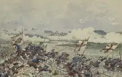 Despite its failure, the threatened offensive led Maria Theresa to ally with Charles Emmanuel III of Savoy in the February 1742 Convention of Turin.[86] The arrival of a British naval squadron outside Naples in August forced Montemar to detach 10,000 troops to help defend the city. This left him too weak to conduct offensive operations, and at the end of the year, he was replaced by Count Gages.[87] On 8 February 1743, the Spanish and Austrians fought an indecisive battle at Campo Santo, the only other incident of note during the year being a skirmish outside Castelfondo in October.[88][89]