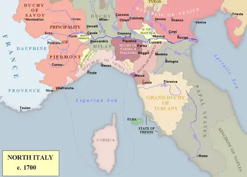 The war in Italy primarily involved the Spanish-ruled Duchy of Milan and the French-allied Duchy of Mantua, considered essential to the security of Austria's southern borders. In 1701, French troops occupied both cities and Victor Amadeus II, Duke of Savoy, allied with France, his daughter Maria Luisa marrying Philip V.[74] In May 1701, an Imperial army under Prince Eugene of Savoy moved into Northern Italy; by February 1702, victories at Carpi, Chiari and Cremona forced the French behind the Adda river.[75]