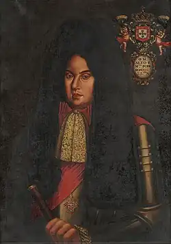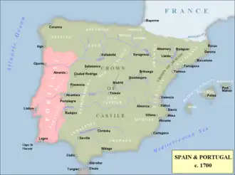 King Peter wished to expand the borders of Brazil to the River Plate and the Oyapock and aquire the Spanish strongholds of Badajoz, Albuquerque, Alcántara, Tui, Baiona, Guarda de Galicia, and Valencia de Alcántara to secure the border of Portugal in Europe.[71] As England did not support this project and the chief of Portuguese diplomacy, the Duke of Cadaval, was pro-France, Peter II initially aligned with the Bourbons in exchange for naval support.[71] Yet Phillip V insisted on addressing him as just "duke of Braganza", which exposed his ambitions to recapturing Portugal, and when the Bourbons failed to produce a fleet that could challenge the allies at sea, Portugal entered the war on the side of the Grand Alliance on May 1703.[71][72][73]