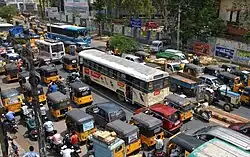 The city is connected to major cities and towns by means of road and railways. National and state highways that pass through the city are National Highway 163, connecting Hyderabad and Bhopalpatnam; NH 563 connecting Ramagundam and Khammam; State highway 3. TSRTC operates buses to various destinations from Hanamkonda and Warangal bus stations of the city.[47] Nearly 78 City buses run in various routes across the city and sub urban areas while 45 city buses run from city to nearby villages.[48]