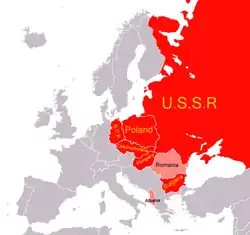 The Warsaw Pact before its 1968 invasion of Czechoslovakia, showing the Soviet Union and its satellites (red) and the two independent non-Soviet members: Romania and Albania (pink)