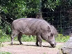 Although covered in bristly hairs, a warthog's body and head appear largely bare, from a distance, with only a crest of hair along the back and the tufts on the face and tail being obvious. The English name "wart"-hog refers to their facial wattles, which are particularly distinct in males. The males also have very prominent tusks, which reach a length of 10 to 25 inches (25 to 64 centimetres); females' tusks are always smaller.[2] They are largely herbivorous, but, like most suids, opportunistically eat invertebrates or small animals, even scavenging on carrion.[3] While both species remain fairly common and widespread, and considered to be of Least Concern by the IUCN, the nominate subspecies of desert warthog, commonly known as the Cape warthog (P. a. aethiopicus) was extinct by around 1865.[4]