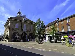 Much of the medieval town centre was destroyed in the Great Fire of Warwick on 5 September 1694, which, within five hours destroyed 460 buildings and left 250 families homeless.[28][29] Thus most of the town-centre buildings are of late 17th and early 18th-century origin, although some medieval timber-framed buildings survive, especially around the edges of the town centre.[29]