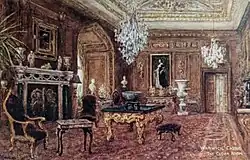 Some weeks later, according to Lady Warwick,[60] it was found that the fire had been started deliberately by their recently employed under-butler.[61] On the Saturday, when the Warwicks were absent, he had asked the housekeeper's permission to bring a friend to show him the castle. Between them the two had stolen all items of value from the private apartments, and the under-butler had started a fire to conceal the robbery.[62]