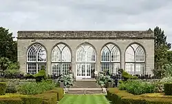 Greville commissioned Italian painter Antonio Canaletto to paint Warwick Castle in 1747,[46] while the castle grounds and gardens were undergoing landscaping by Brown. Five paintings and three drawings of the castle by Canaletto are known, making it the artist's most often represented building in Britain.[47] Canaletto's work on Warwick Castle has been described as "unique in the history of art as a series of views of an English house by a major continental master".[48] As well as the gardens, Greville commissioned Brown to rebuild the exterior entrance porch and stairway to the Great Hall.[49] Brown also contributed Gothick designs for a wooden bridge over the Avon (1758).[50] He was still at work on Warwick Castle in 1760. Timothy Lightoler was responsible for the porch being extended and extra rooms added adjacent to it in 1763–69.[49] and during the same years William Lindley provided a new Dining Room and other interior alterations.[51] In 1786–88 the local builder William Eboral was commissioned to build the new greenhouse conservatory, with as its principal ornament the Warwick Vase, recently purchased in Rome.[52]