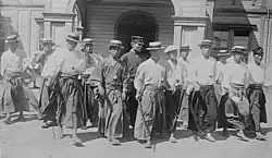 Ōkuma had long desired to create an academic cap so distinctive that someone wearing the cap would immediately be identified as a Waseda student.[20] The chief tailor of Takashimaya, Yashichiro, was called upon to design a cap in three days. Each square cap was stamped on the inside with the student's name, his department, the school seal and the legend, "This certifies that the owner is a student of Waseda". Thus, the cap served as a form of identification, and effectively a status symbol. The cap, with its gold-braided badge, is registered as a trademark.