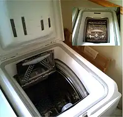 In 2001, Whirlpool Corporation introduced the Calypso, the first vertical-axis high-efficiency washing machine to be top-loading. A washplate in the bottom of the tub nutated (a special wobbling motion) to bounce, shake, and toss the laundry. Simultaneously, water containing detergent was sprayed onto the laundry. The machine proved to be good at cleaning but gained a bad reputation due to frequent breakdowns and destruction of laundry. The washer was recalled with a class-action lawsuit[92] and pulled off the market.