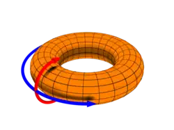 In a top-loading washer, water circulates primarily along the poloidal axis during the wash cycle, as indicated by the red arrow in this illustration of a torus.