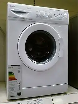 A Beko washing machine; modern household washing machines start at 1 kg (2 lb) capacity, designed for smaller households, and span to 24 kg (53 lb) load capacity.