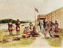 Explorer David Thompson, on his voyage down the Columbia River, camped at the confluence with the Snake River on July 9, 1811,[38] and erected a pole and a notice claiming the territory for Great Britain and stating the intention of the North West Company to build a trading post at the site.