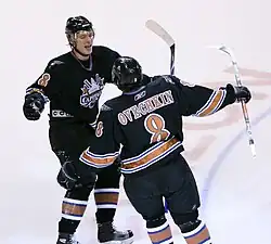 In the 2004 NHL entry draft, the Capitals won the draft lottery, moving ahead of the Pittsburgh Penguins, who held the NHL's worst record, and selected Alexander Ovechkin first overall.[86] During the NHL labor dispute of 2004–05, which cost the NHL its entire season, Ovechkin stayed in Russia, playing for Dynamo Moscow.[87] The Capitals' 2005 off-season consisted of making D.C.-area native Halpern the team's captain.[88]