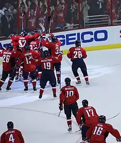 The lockout-shortened 2012–13 season saw the Capitals off to a rocky start, as they managed just two wins in their first ten games.[129] The team rebounded to win the Southeast Division, earning the third seed in the Eastern Conference for the 2013 playoffs.[130] However, in the playoffs, the Capitals' fell to the Rangers in seven games for the second consecutive season.[131]