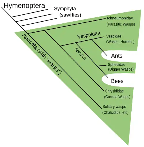3. ^ Johnson, Brian R.; Borowiec, Marek L.; Chiu, Joanna C.; Lee, Ernest K.; Atallah, Joel; Ward, Philip S. (2013). "Phylogenomics Resolves Evolutionary Relationships among Ants, Bees, and Wasps" (PDF). Current Biology. 23 (20): 2058–2062. Bibcode:2013CBio...23.2058J. doi:10.1016/j.cub.2013.08.050. PMID 24094856. S2CID 230835.