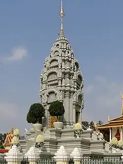 - Chedei (Khmer: ចេតិយ) or Chedi (Thai: เจดีย์; Lao: ເຈດີ) from Sanskrit: chaitya, temple or that (Lao: ທາດ): It is also known as a Stupa (Thai: สถูป). Usually conical or bell-shaped buildings, but many Cambodian stupas are constructed in the style of temple shrine. They often contain relics of Buddha. The urns containing the ashes of the cremated dead are kept here and serve as memorials for those ancestors.