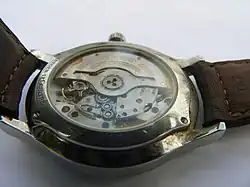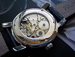 A Russian mechanical watch movement with exhibition case back, showing its movement.