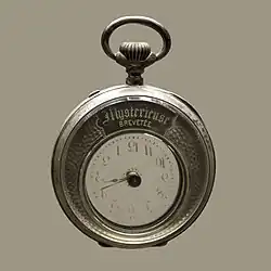 A so-called mystery watch, it is the first transparent watch,[57] c. 1890. The movement is fitted with a cylinder escapement.