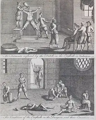 Agents of the Dutch East India Company used a precursor to waterboarding during the Amboyna massacre of English prisoners, which took place on the island of Amboyna in the Molucca Islands in 1623. At that time, it consisted of wrapping cloth around the victim's head, after which the torturers "poured the water softly upon his head until the cloth was full, up to the mouth and nostrils, and somewhat higher, so that he could not draw breath but he must suck in all the water".[88][89][90][91] In one case, the torturer applied water three or four times successively until the victim's "body was swollen twice or thrice as big as before, his cheeks like great bladders, and his eyes staring and strutting out beyond his forehead".[90][91][92][93]