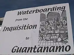 Waterboarding or controlled drowning is a form of torture in which water is poured over a cloth covering the face and breathing passages of an immobilized captive, causing the person to experience the sensation of drowning. In the most common method of waterboarding, the captive's face is covered with cloth or some other thin material and immobilized on their back at an incline of 10 to 20 degrees.[1][2] Torturers pour water onto the face over the breathing passages, causing an almost immediate gag reflex and creating a drowning sensation for the captive.[3][4][5] Normally, water is poured intermittently to prevent death; however, if the water is poured uninterruptedly it will lead to death by asphyxia. Waterboarding can cause extreme pain, damage to lungs, brain damage from oxygen deprivation, other physical injuries including broken bones due to struggling against restraints, and lasting psychological damage.[6] Adverse physical effects can last for months, and psychological effects for years.[7] The term "water board torture" appeared in press reports as early as 1976.[8]