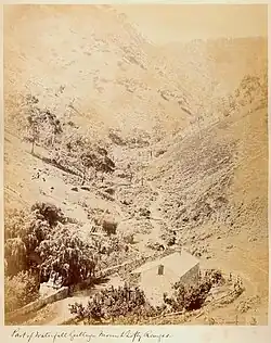Other parts of the Waterfall Gully area were subdivided, though, and much of the area was owned by Samuel Davenport. Davenport used the land for timber, grazing, and the cultivation of various crops, including olives and grapes for wine production.[20] Other local residents ran market gardens and nurseries. For example, local residents Wilhelm Mügge and his wife Auguste Schmidt operated "one of the best nurseries and market gardens near Adelaide", and gained a reputation for the cheeses produced from their local dairy farm.[21] Along with farming, the hills and creek were prized areas for the sawyers and splitters,[12] and a number of mines were established in the region from the mid-to-late 19th century. In 1844 the first silver-lead, manganese and iron mines were established in the area, while the 1890s saw a minor gold rush—although "only small quantities were extracted".[22] Of greater success was stone quarrying in Chambers' Gully, which began in 1863 and increased in scale in 1912.[22]