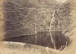 One of the earliest accounts of Waterfall Gully comes from a "Mr Kent" who, along with Captain Collet Barker and Barker's servant, Miles, climbed Mount Lofty in 1831. In making their ascent the party skirted a ravine—described by Mr Kent as possessing "smooth and grassy sides"—which is believed by Anne Hardy to have been Waterfall Gully.[5] Subsequent to Barker's ascent, the first settlers who were recorded as having climbed Mount Lofty were Bingham Hutchinson and his servant, William Burt. The pair made three attempts to scale the mount before succeeding, and for their first attempt they attempted to traverse Waterfall Gully.[13] The attempt was unsuccessful, but in July 1837, Hutchinson wrote about the gully through which they had travelled. Waterfall Gully he wrote, had proven difficult, as the plants were so thickly grown as to provide a significant barrier to their progress. Near the point of surrender, Hutchinson described how they were "agreeably surprised by seeing a wall of rock about fifty or sixty feet [fifteen to eighteen metres] high, which stretched across the ravine, and from the top of it leapt the brook which had so long been [their] companion".[14] The brook was First Creek, and the waterfall they sighted is today known as First Falls.[15]