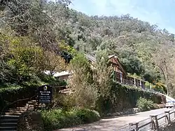 The completion of the road led to an increase in visitor numbers.[27] Rather than a bumpy horse ride,[29] visitors could now catch the horse tram to the start of the gully, and walk, cycle or ride to the falls.[30] To provide for tourists, the area gained a number of road-side kiosks and produce stalls, and the Mügge family erected the two-storey Waterfall Hotel along the path. Furthermore, in 1912 the government opened a kiosk at the base of First Falls,[27] designed in the "style of a Swiss chalet".[31] The hotel is a private residence today, but the kiosk continues to operate.[27]