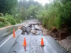 Over the years since European settlement Waterfall Gully has suffered from both bushfires and flooding. The gully was severely hit by a number of bushfires in 1939 that threatened the area, and further bushfires in the early 1940s caused considerable damage because of the war effort diverting supplies and personnel from the Emergency Fire Service.[36] Significant floods occurred in 1889 and 1931,[37] and, on the night of 7 November 2005, Waterfall Gully was one of several areas in Adelaide to experience severe flooding. Waterfall Gully was one of the hardest hit suburbs: Bob Stevenson, Duty Officer of the State Emergency Service (SES), commented that "There's an area called Waterfall Gully Road, in the foothills, where one of the creeks comes down, and there's quite a few houses affected there ... there was 40 or so houses affected on that one road alone."[38] Properties were flooded, two bridges nearly collapsed, and 100 m (330 ft) of road was washed away. Burnside council workers, the Country Fire Service (CFS) and the SES repaired the initial damage on the night while reconstruction of infrastructure commenced in late November. Much of the road had been inaccessible, and the suburb was closed except to residents and emergency workers for the remainder of the month.[39]