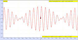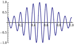 Amplitude modulation can be achieved through f(x,t) = 1.00×sin(2π/0.10×(x−1.00×t)) and g(x,t) = 1.00×sin(2π/0.11×(x−1.00×t)). Only the resultant is visible to improve clarity of waveform.