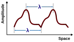 In the case of a periodic function F with period λ, that is, F(x + λvt) = F(xvt), the periodicity of F in space means that a snapshot of the wave at a given time t finds the wave varying periodically in space with period λ (the wavelength of the wave). In a similar fashion, this periodicity of F implies a periodicity in time as well: F(xv(t + T)) = F(xvt) provided vT = λ, so an observation of the wave at a fixed location x finds the wave undulating periodically in time with period T = λ/v.[15]