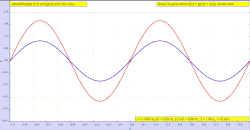 Animation of two waves, the green wave moves to the right while blue wave moves to the left, the net red wave amplitude at each point is the sum of the amplitudes of the individual waves. Note that f(x, t) + g(x, t) = u(x, t).