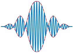 Illustration of the envelope (the slowly varying red curve) of an amplitude-modulated wave. The fast varying blue curve is the carrier wave, which is being modulated.