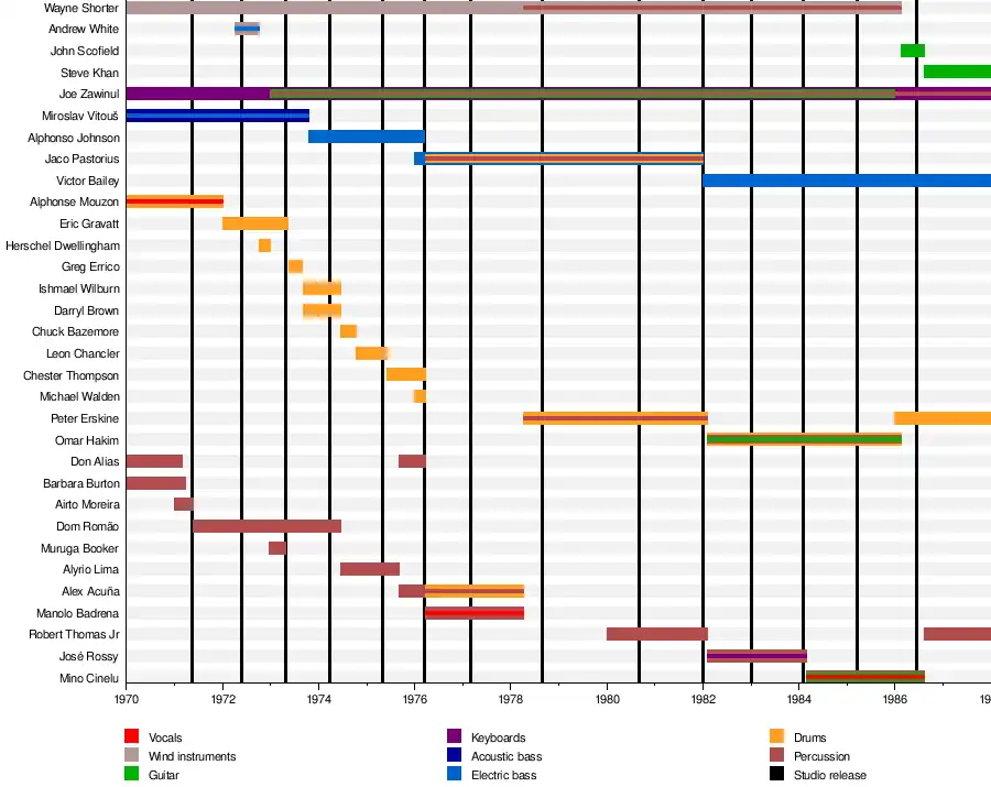 | Past members | Joe Zawinul Wayne Shorter Jaco Pastorius Miroslav Vitouš Alphonse Mouzon Don Alias Airto Moreira Muruga Booker Dom Um Romão Eric Gravatt Greg Errico Alphonso Johnson Leon "Ndugu" Chancler Narada Michael Walden Chester Thompson Alex Acuña Manolo Badrena Peter Erskine Robert Thomas Jr. Omar Hakim Victor Bailey Mino Cinélu Steve Gadd Tony Williams Andrew White |