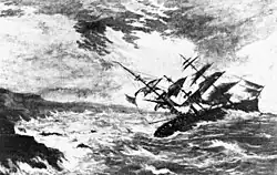 A storm in October 1859 that caused the loss of the Royal Charter inspired FitzRoy to develop charts to allow predictions to be made, which he called "forecasting the weather", thus coining the term "weather forecast".[17] Fifteen land stations were established to use the telegraph to transmit to him daily reports of weather at set times leading to the first gale warning service. His warning service for shipping was initiated in February 1861, with the use of telegraph communications. The first daily weather forecasts were published in The Times in 1861.[16] In the following year a system was introduced of hoisting storm warning cones at the principal ports when a gale was expected.[18] The "Weather Book" which FitzRoy published in 1863 was far in advance of the scientific opinion of the time.
