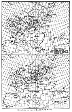 As the electric telegraph network expanded, allowing for the more rapid dissemination of warnings, a national observational network was developed, which could then be used to provide synoptic analyses. To shorten detailed weather reports into more affordable telegrams, senders encoded weather information in telegraphic code, such as the one developed by the U.S. Army Signal Corps.[19] Instruments to continuously record variations in meteorological parameters using photography were supplied to the observing stations from Kew Observatory – these cameras had been invented by Francis Ronalds in 1845 and his barograph had earlier been used by FitzRoy.[20][21]
