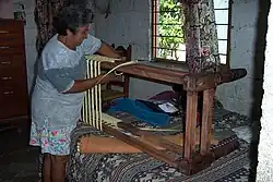 Silk weaving in China was an intricate process that was very involved. Men and women, usually from the same family, had their own roles in the weaving process. The actual work of weaving was done by both men and women.[40] Women were often weavers since it was a way they could contribute to the household income while staying at home.[41] Women would usually weave simpler designs within the household while men would be in charge of the weaving of more intricate and complex pieces of clothing.[42] The process of sericulture and weaving emphasized the idea that men and women should work together instead of women being subordinate to men. Weaving became an integral part of Chinese women's social identity. Several rituals and myths were associated with the promotion of silk weaving, especially as a symbol of female power. Weaving contributed to the balance between men and women's economic contributions and had many economic benefits.[41][43]