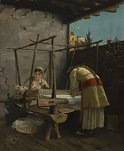 There were many paths into the occupation of weaver. Women usually married into the occupation, belonged to a family of weavers and or lived in a location that had weather conditions suitable for the process of silk weaving. Weavers usually belonged to the peasant class.[44] Silk weaving became a specialized job requiring specific technology and equipment that was completed domestically within households.[45] Although most of the silk weaving was done within the confines of the home and family, there were some specialized workshops that hired skilled silk weavers as well. These workshops took care of the weaving process, although the raising of the silkworms and reeling of the silk remained work for peasant families. The silk that was woven in workshops rather than homes were of higher quality, since the workshop could afford to hire the best weavers.[46] These weavers were usually men who operated more complicated looms, such as the wooden draw-loom.[47] This created a competitive market of silk weavers.