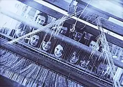 Power loom workers were usually girls and young women. They had the security of fixed hours, and except in times of hardship, such as in the cotton famine, regular income. They were paid a wage and a piece work bonus. Even when working in a combined mill, weavers stuck together and enjoyed a tight-knit community.[87] The women usually minded the four machines and kept the looms oiled and clean. They were assisted by 'little tenters', children on a fixed wage who ran errands and did small tasks. They learnt the job of the weaver by watching.[86] Often they would be half timers, carrying a green card which teacher and overlookers would sign to say they had turned up at the mill in the morning and the afternoon at the school.[88] At fourteen or so they come full-time into the mill, and started by sharing looms with an experienced worker where it was important to learn quickly as they would both be on piece work.Serious problems with the loom were left to the tackler to sort out. He would inevitably be a man, as were usually the overlookers. The mill had its health and safety issues, there was a reason why the women tied their hair back with scarves. Inhaling cotton dust caused lung problems, and the noise was causing total hearing loss. Weavers would mee-maw as normal conversation was impossible. Weavers used to 'kiss the shuttle', that is, suck thread through the eye of the shuttle. This left a foul taste in the mouth due to the oil, which was also carcinogenic.[89]