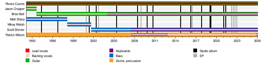 ![]() From left: Rivers Cuomo, Patrick Wilson, Brian Bell, and Scott Shriner in 2025 | |