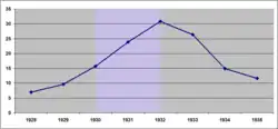 The first recorded mention of the term Republik von Weimar (Republic of Weimar) came during a speech delivered by Adolf Hitler at a Nazi Party rally in Munich on 24 February 1929. A few weeks later, the term Weimarer Republik was first used, again by Hitler in a newspaper article.[13] Only during the 1930s did the term become mainstream, both within and outside Germany.