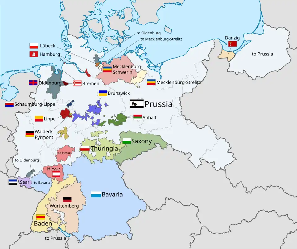 German states in 1925 (with Prussia and its provinces shown in blue)
