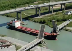 At around noon on Wednesday September 30, 2015, the Lena J cargo ship collided with Bridge 19 in Port Colborne, closing the bridge to all vehicle and pedestrian traffic until an assessment could be made on the condition of the bridge.[19][20] The vessel had sustained damage to its bridge, but was still able to continue on its voyage to Burns Harbour, Indiana. Pictures of the damage sustained to the vessel and Bridge 19 were captured.[21] On Friday October 1, 2015, Chris Lee, an acting direct engineer for the City of Port Colborne, said that the St. Lawrence Seaway Management Corporation (SLSMC) will likely close the bridge to all vehicle traffic until the end of the year. However, pedestrians will be able to cross the bridge, and emergency services will be able to cross the bridge on a limited basis.[22][23][19][24] On Tuesday October 6, 2015, the City of Port Colborne released a media statement, which stated that Bridge 19, "will remain closed to vehicular traffic until after the close of the shipping season in December. Repairs will begin in early January." Detour routes have been planned and mapped by the City of Port Colborne and the City of Welland in order to ease the flow of traffic over Bridge 19A.[25]