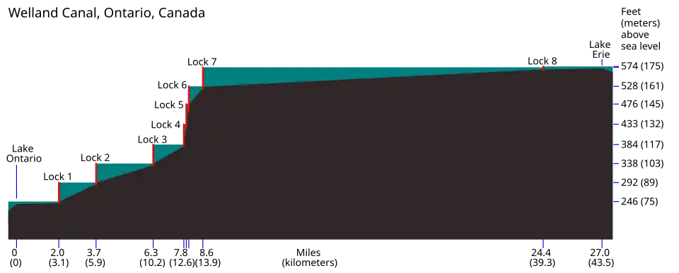 The southern terminus of the canal on Lake Erie is 99.5 metres (326 feet) higher than the northern terminus on Lake Ontario. The canal includes eight 24.4-metre-wide (80 ft) ship locks.[4] Seven of the locks (Locks 1–7, the 'Lift' locks) are 233.5 m (766 ft) long, and raise (or lower) passing ships by between 13 and 15 m (43 and 49 ft) each. The southernmost lock, (Lock 8 – the 'Guard' or 'Control' lock) is 349.9 m (1,148 ft) in length.[1]