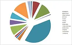 Wembley is known for its high degree of ethnic and religious diversity, and the population includes a large number of people of Asian, Afro-Caribbean and Eastern European origin.[43][44] According to the 1991 census, 49.2% of the Wembley Central ward identified themselves as Asian (39% Indian). The ward along with neighbouring Tokyngton (eastern Wembley) and Alperton were in the top 10 most diverse in London. In the 2001 census, 78.6% of the ward identified themselves as being of black or minority ethnic (BME) groups.[45][46] The White British population of Wembley Central (792 people, 5.3% of the population) in the 2011 census makes it the sixth least White British ward in London (seventh in the country).[47] Other ethnicities include 7.0% Other White, 66.2% Asian (46.2% Indian), and 13.9% Black.[47] In 2011, 86% of Wembley Central ward was of BAME background, which is the highest in Brent and 5th highest in Greater London. In Wembley the lowest BAME ward was Northwick Park, 68.8%.[48]