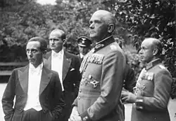 Blomberg's interactions with the SA in East Prussia led him to the conclusion that Nazis made for excellent soldiers, which further increased the appeal of Nazism for him.[11] But at the same time, Blomberg saw the SA only as a junior partner to the Army, and utterly opposed the SA's ambitions to replace the Reichswehr as Germany's main military force. Blomberg, like almost all German generals, envisioned a future Nazi-Army relationship where the Nazis would indoctrinate ordinary people with the right sort of ultra-nationalist, militarist values so that when young German men joined the Reichswehr they would be already half-converted into soldiers while at the same time making it clear that control of military matters would rest solely with the generals. In 1931, he visited the US, where he openly proclaimed his belief in the certainty and the benefits of a Nazi government for Germany.[12] Blomberg's first wife Charlotte died on 11 May 1932, leaving him with two sons and three daughters.[13][14]