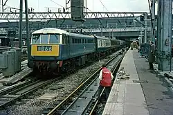 A new set of high-speed long-distance services was introduced in 1966, launching British Rail's highly successful "Inter-City" brand[25] (the hyphen was later dropped) and offering journey times as London to Birmingham in 1 hour 35 minutes, and London to Manchester or Liverpool in 2 hours 40 minutes (and even 2 hours 30 minutes for the twice-daily Manchester Pullman).[26] This represented a big improvement on the 3 hours 30 minutes to Manchester and Liverpool of the fastest steam service. A new feature was that these fast trains were offered on a regular-interval service throughout the day: initially hourly to Birmingham, two-hourly to Manchester, and so on.[27] The service proved to be so popular that in 1972 these InterCity service frequencies were doubled to deal with increased demand.[28] With the completion of the northern electrification in 1974, London to Glasgow journey times were reduced from 6 hours to 5.[9] Along with electrification came modern coaches such as the Mark 2 and from 1974 the fully integral, air-conditioned Mark 3 design. These remained the mainstay of express services until the early 2000s. Line speeds were raised to a maximum 110 mph (180 km/h), and these trains, hauled by Class 86 and Class 87 electric locomotives, came to be seen as BR's flagship passenger service. Passenger traffic on the WCML doubled between 1962 and 1975.[29]