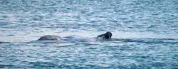 Manatees have been shown to form large mating herds when males come across estrous females, indicating that males may be able to sense estrogen or other chemical indicators.[37][38] Manatees can communicate information to each other through their vocalization patterns.[39] Sex and age-related differences are apparent in the vocalization structure of common squeaks and screeches in adult males, adult females, and juveniles.[40][41][42] This may be an indication of vocal individuality among manatees.[41] An increase in manatee vocalization after a vocal playback stimulus shows that they may be able to recognize another manatee's individual voice.[41] This behavior in manatees is found mostly between mother and calf interactions.[43] However, vocalization can still be commonly found in a variety of social interactions within groups of manatees, which is similar to other aquatic mammals.[43] When communicating in noisy environments, manatees that are in groups experience the same Lombard effect as humans do; where they will involuntary increase their vocal effort when communicating in loud environments.[44] Based on acoustic and anatomical evidence, mammalian vocal folds are assumed to be the mechanism for sound production in manatees.[45] Manatees also eat other manatees' feces; it is assumed that they do this to gather information about reproductive status or dominance, indicating the important role chemoreception plays in the social and reproductive behavior of manatees.[37]